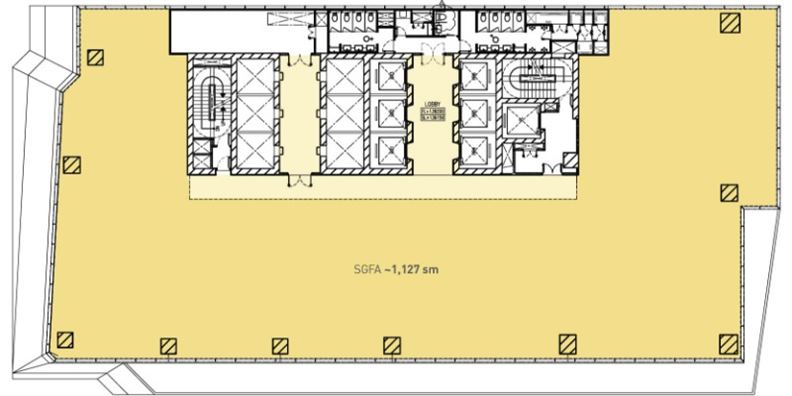 | Tinggi Plafon | Lantai Ground - 12 m Lantai Typical : 2.95, clear height without raised floor 2.80, clear height with raised floor |